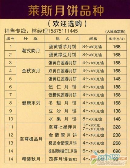 正文摘要:優(yōu)惠品種數(shù)量有限,售完即止 歡迎廣大朋友訂購(gòu),林小姐:15875111445(歡迎朋友們加微信好友了解更多萊斯月餅祥情) QQ:413778007(空間有相關(guān)價(jià)目表及品種介紹) 提前購(gòu)買,折扣更低 |