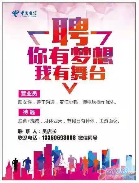 正文摘要:本帖最后由 武江區(qū)歐杰通訊 于 2021-3-23 11:10 編輯 招聘電信營業(yè)員,業(yè)務(wù)員各兩名,月休4天,工作地點沙洲尾鴻洲花園,有意者請撥打13360693008,微信號13640003885,謝謝 |