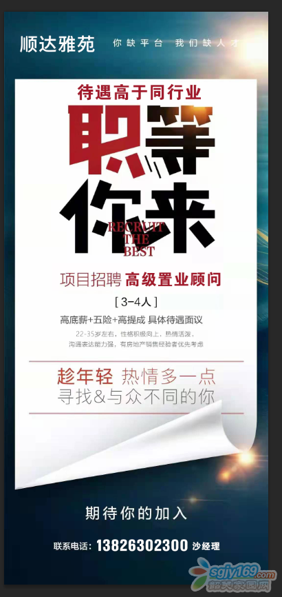 正文摘要:熟手,無責(zé)任底薪3500元/月,完成任務(wù)追加至5000元/月。提成2000-9000元/套不等。順達(dá)雅苑現(xiàn)房銷售,無需守盤,貨源充足,發(fā)傭快。年齡不限 |